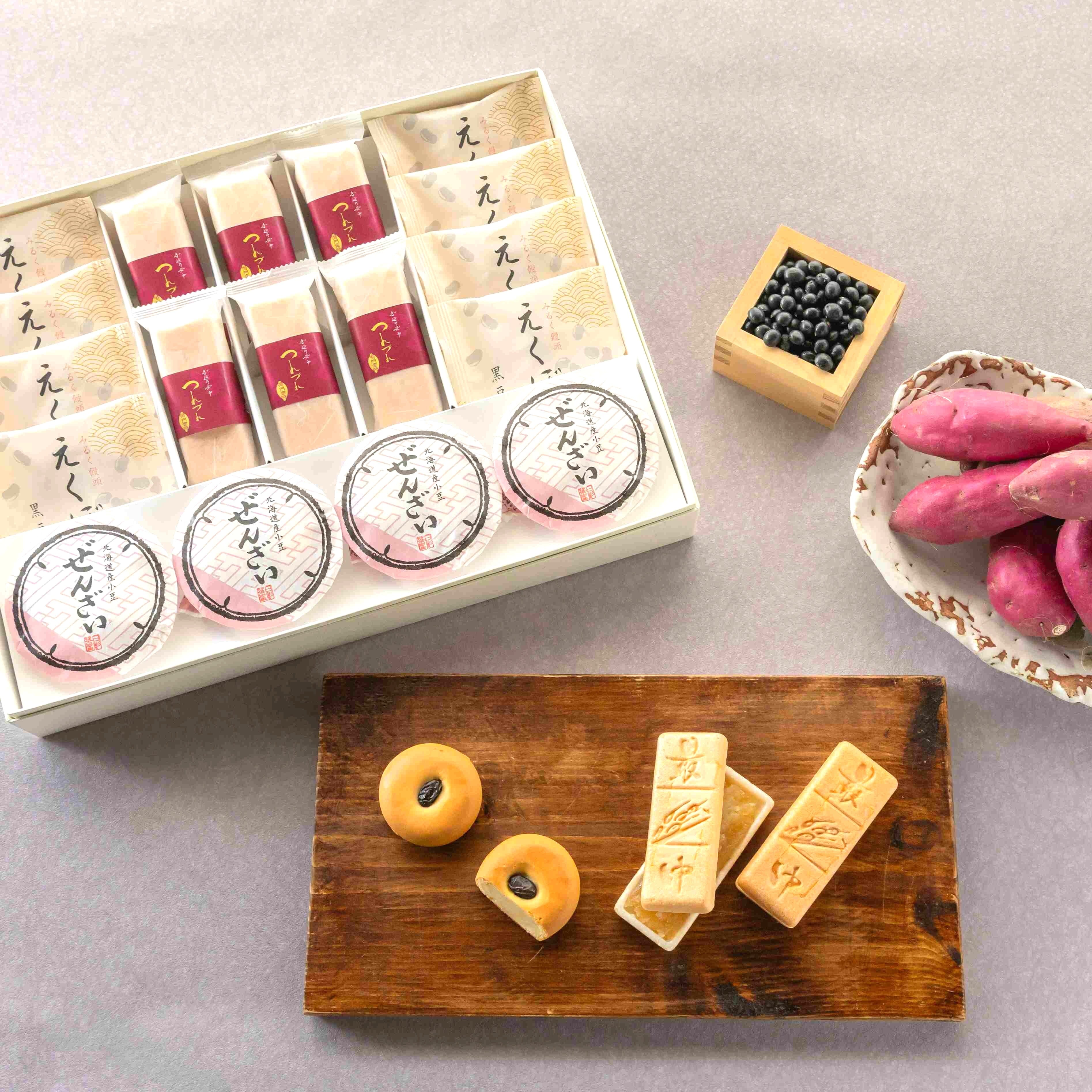 18個入:みるく饅頭えくぼ×8個、手造り最中つれづれ芋餡×各6個、ぜんざい×各4個