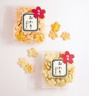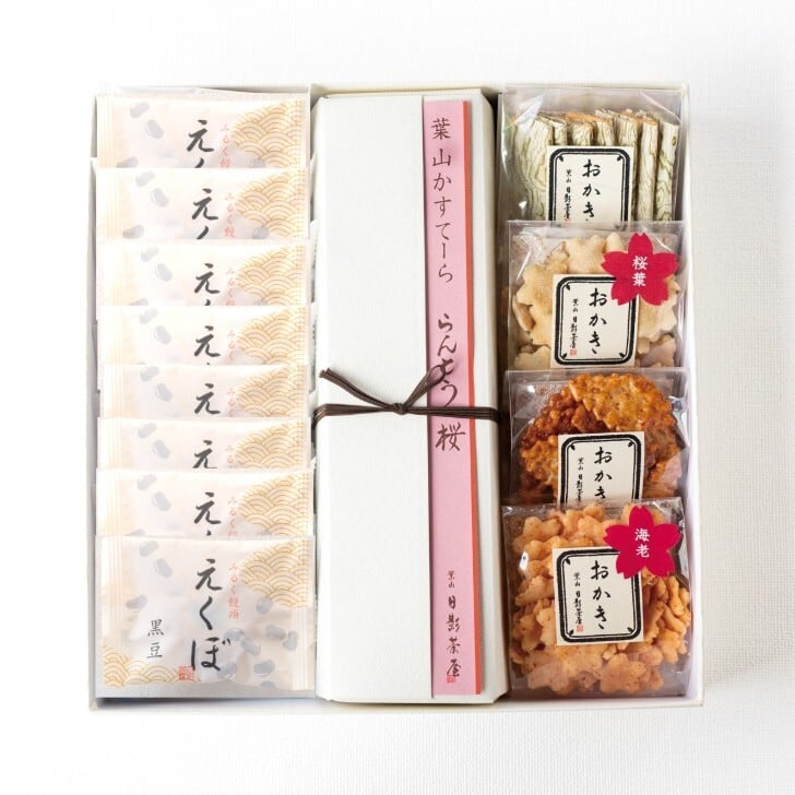 らんとう桜×1、さくらおかき(桜葉、海老)各×1、おかき(おぼろ、里おかき)各×1、みるく饅頭えくぼ×8