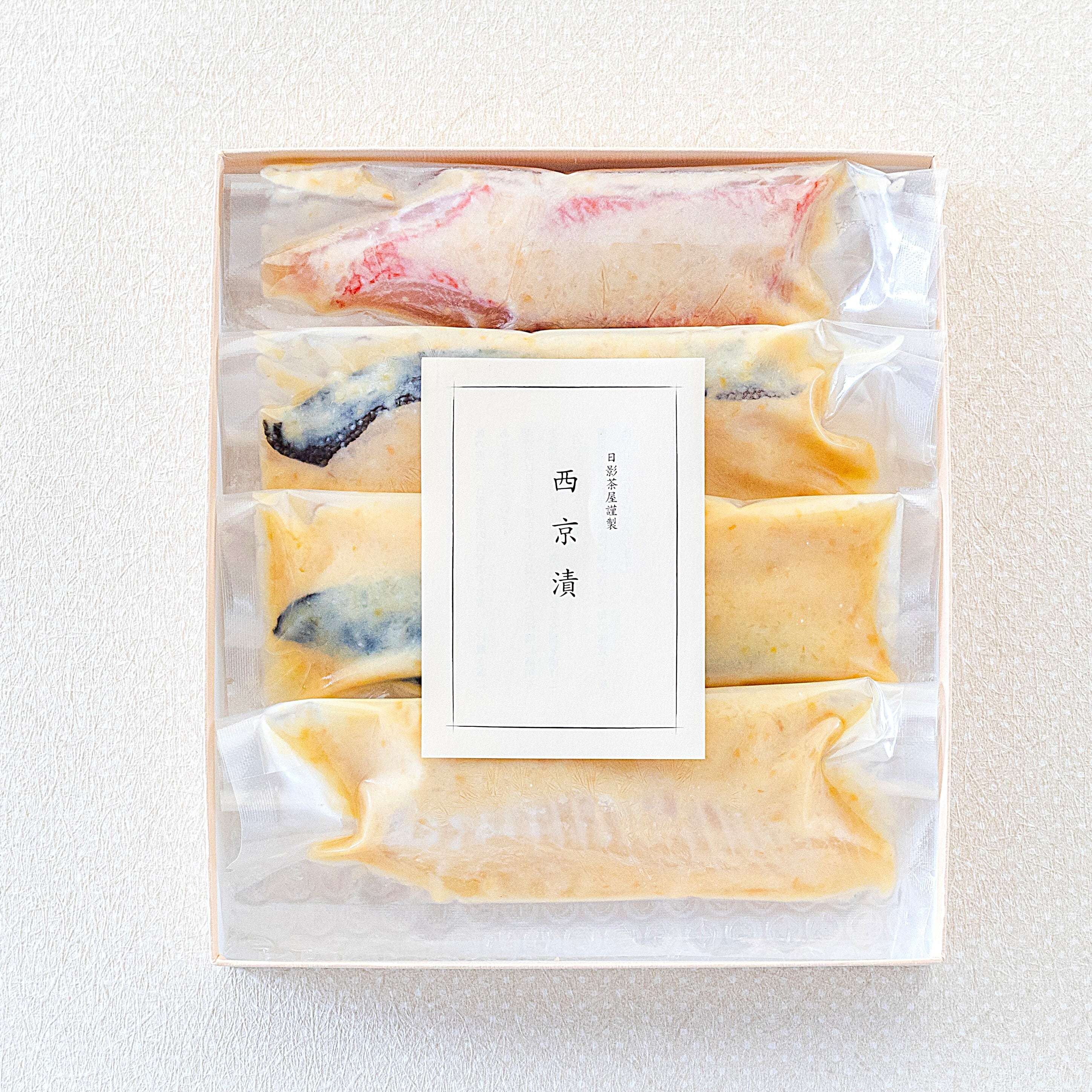 厳選された新鮮な魚を使用し、日影茶屋独自の西京味噌に漬け込むことで、豊かな風味と旨味を引き出しています。職人が伝統的な西京漬けの技法で1枚1枚丁寧に仕上げた逸品です。4種の旨味たっぷりの魚と甘みのある西京味噌が絶妙に絡み合い、食卓を彩る贅沢なセットです。